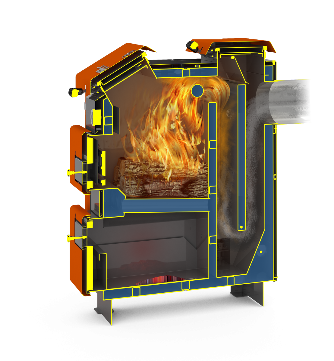 - Водотрубный теплообменник обеспечивает наилучший теплосъем и существенно увеличивает эффективность котла.