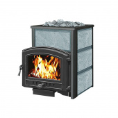 Конвекционно–вентилируемая облицовка, изготовленная из экологически чистой горной породы , который обладает большой теплоёмкостью, что позволяет камню в короткие сроки нагреваться и максимально долго удерживать стабильную температуру в парильном помещении, а также гасить жёсткое инфракрасное излучение Камень обладает исключительными лечебными свойствами: помогает при головных болях, при нестабильном артериальном давлении, при простудных заболеваниях, воспалительных процессах в почках и пищеварительной системе, снимает повышенную возбудимость и нервозность, сглаживает эмоциональные всплески. Облицовка из натурального камня при нагреве способна аккумулировать тепло, что гарантирует максимально равномерный прогрев и сохранение тепла Банная печь ЛЕГЕНДА 16 (224) укомплектован чугунной каминной, самоохлаждаемой дверцей Везувий 224 с большим жаропрочным стеклом «SCHOTT ROBAX», с оборудованной системой самоочистки, что позволяет визуально контролировать горение и любоваться видом живого огня. Данная печь рассчитана на объем парильного помещения 8-18 м3.