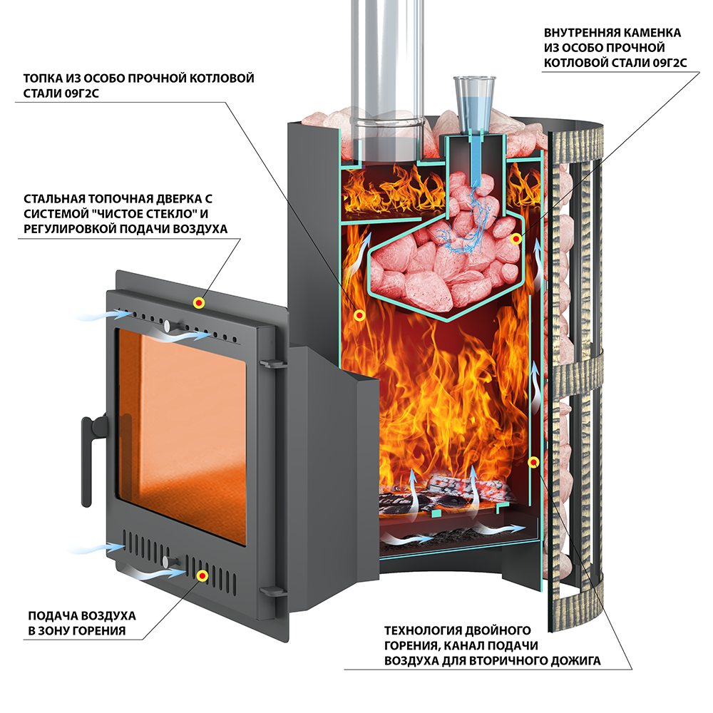 Печь изготовлена из особо прочной котловой стали 09Г2С, рассчитанной на работу при высоких температурах и давлении. Толщина стенок печи 4-6 мм. Топочный тоннель сделан из стали толщиной 4 мм, что позволяет топить дрова длиной более 50 см.